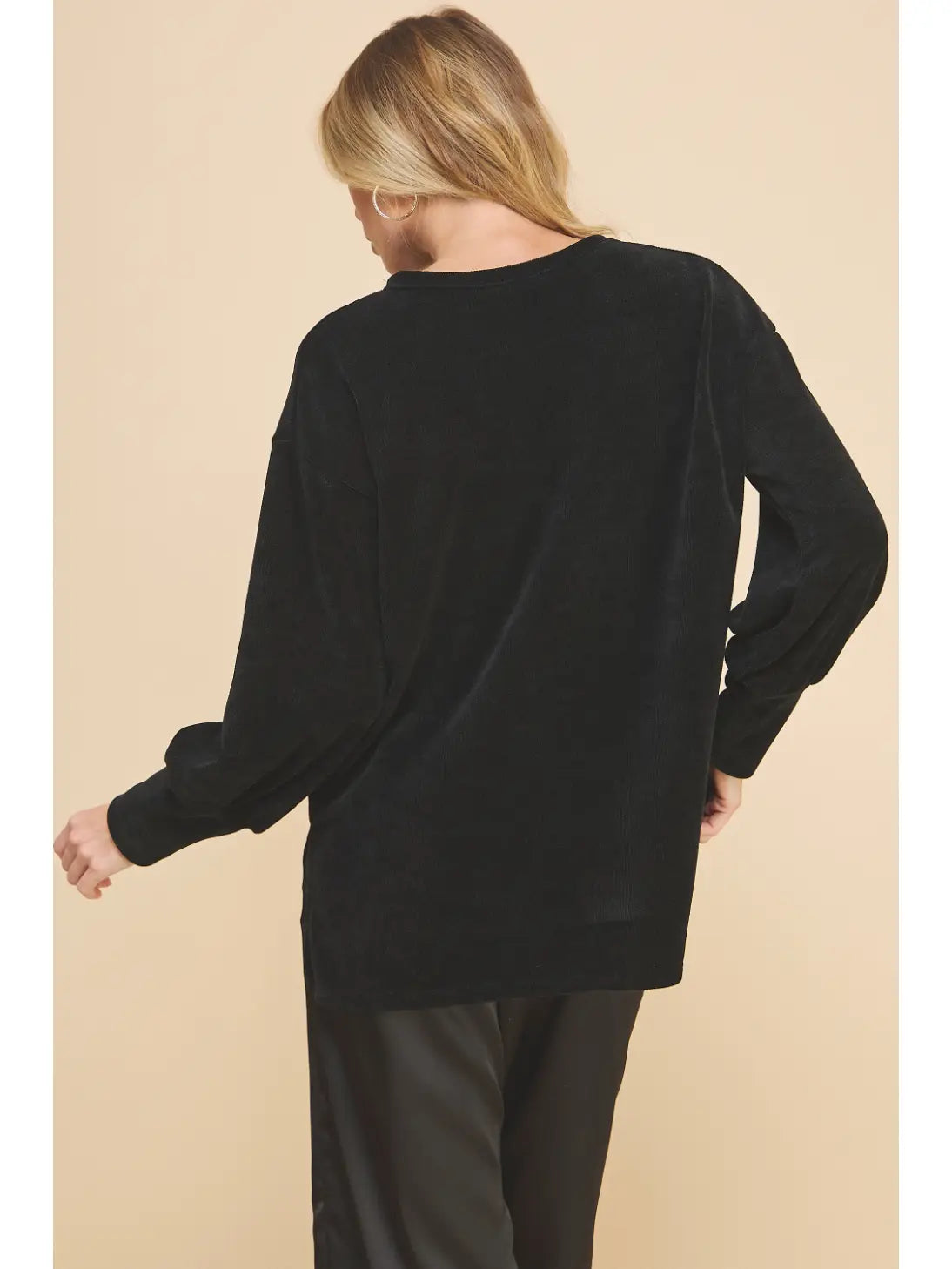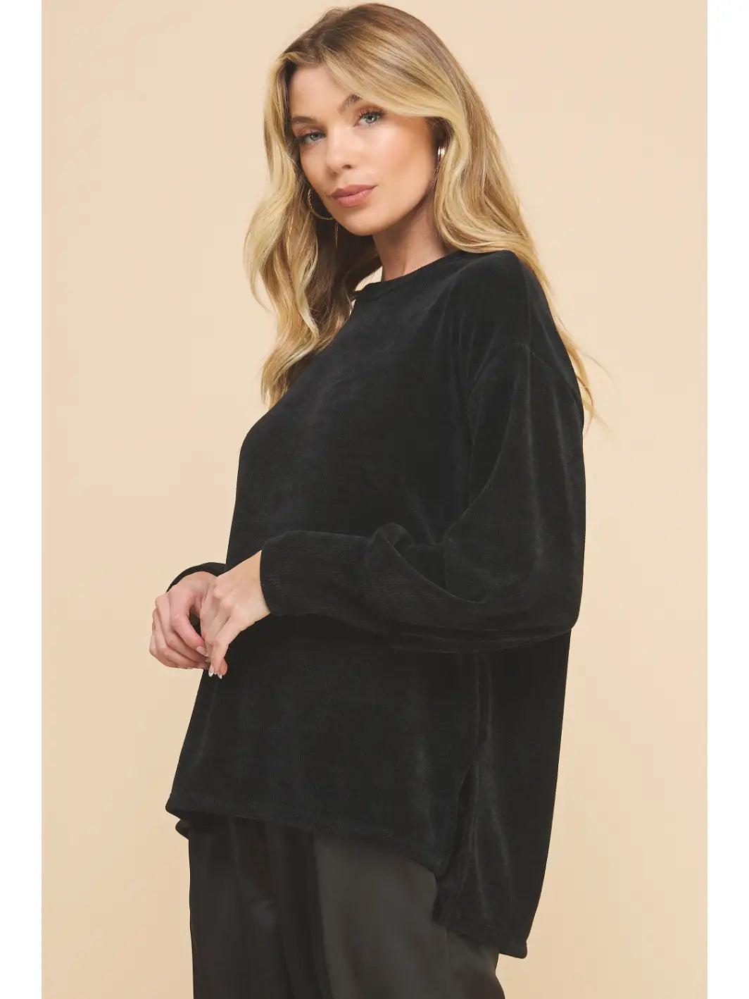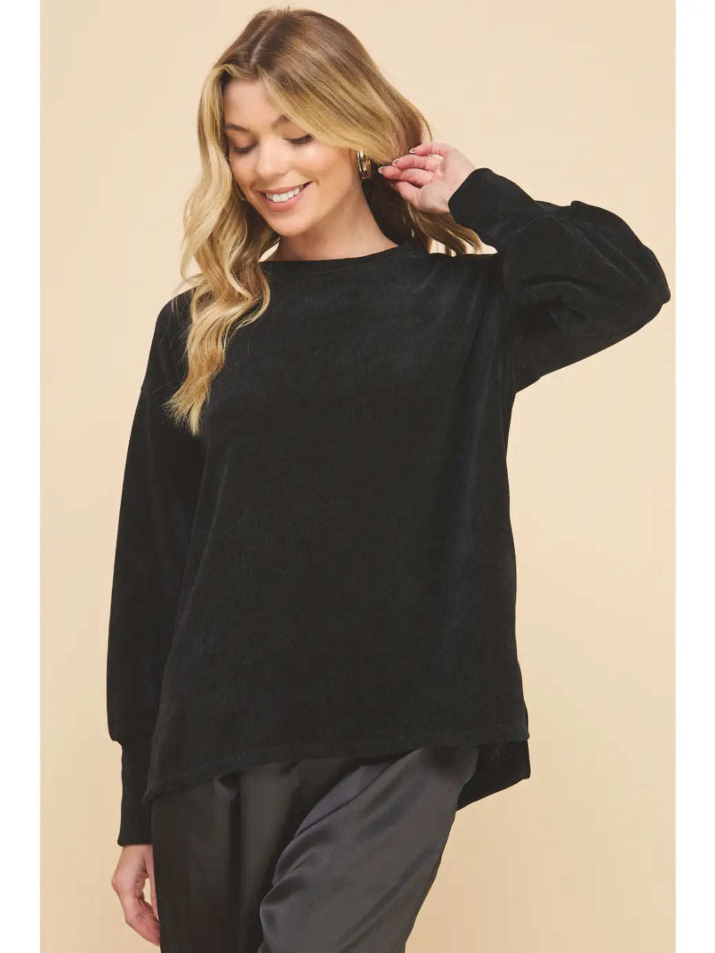 Black, chenille, long sleeve crewneck sweater.