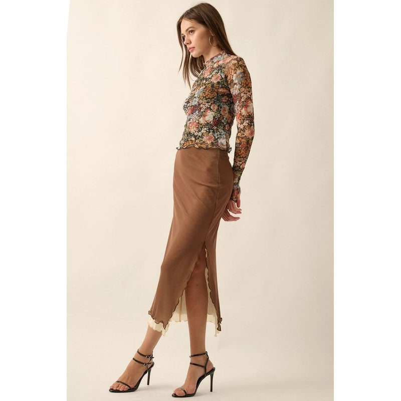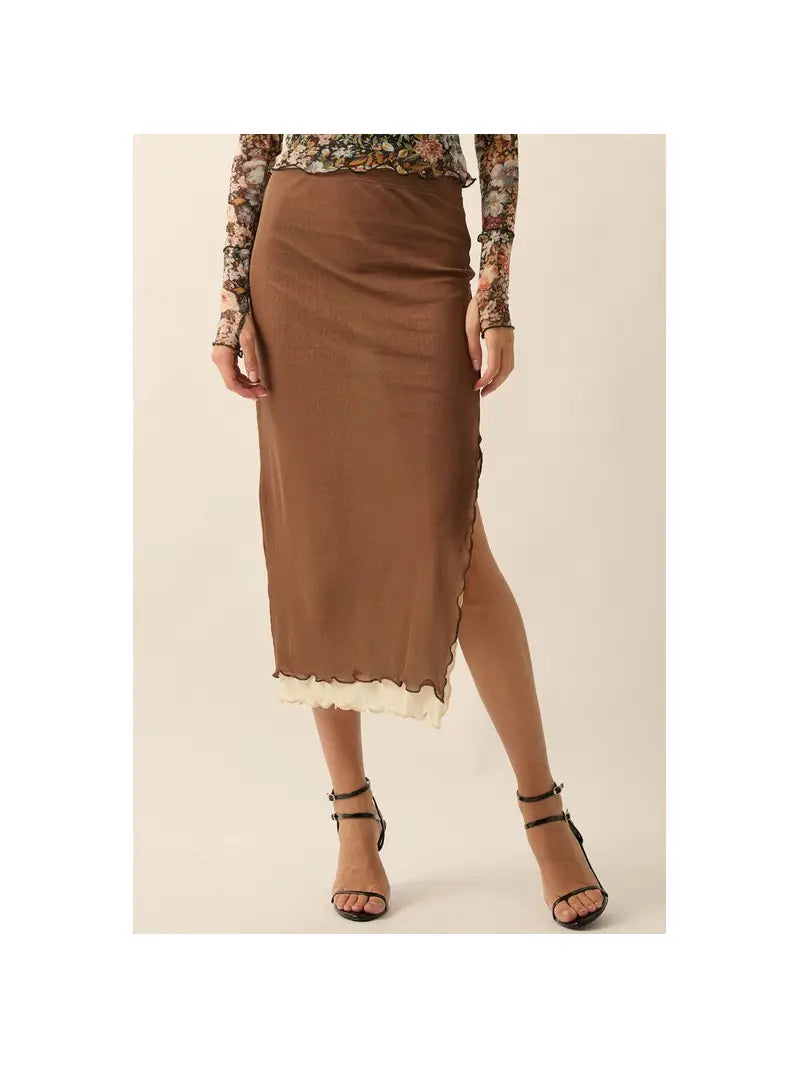 idi skirt. Side slit lined with contrasting color. Lettuce-edge hem fitted silhouette.
