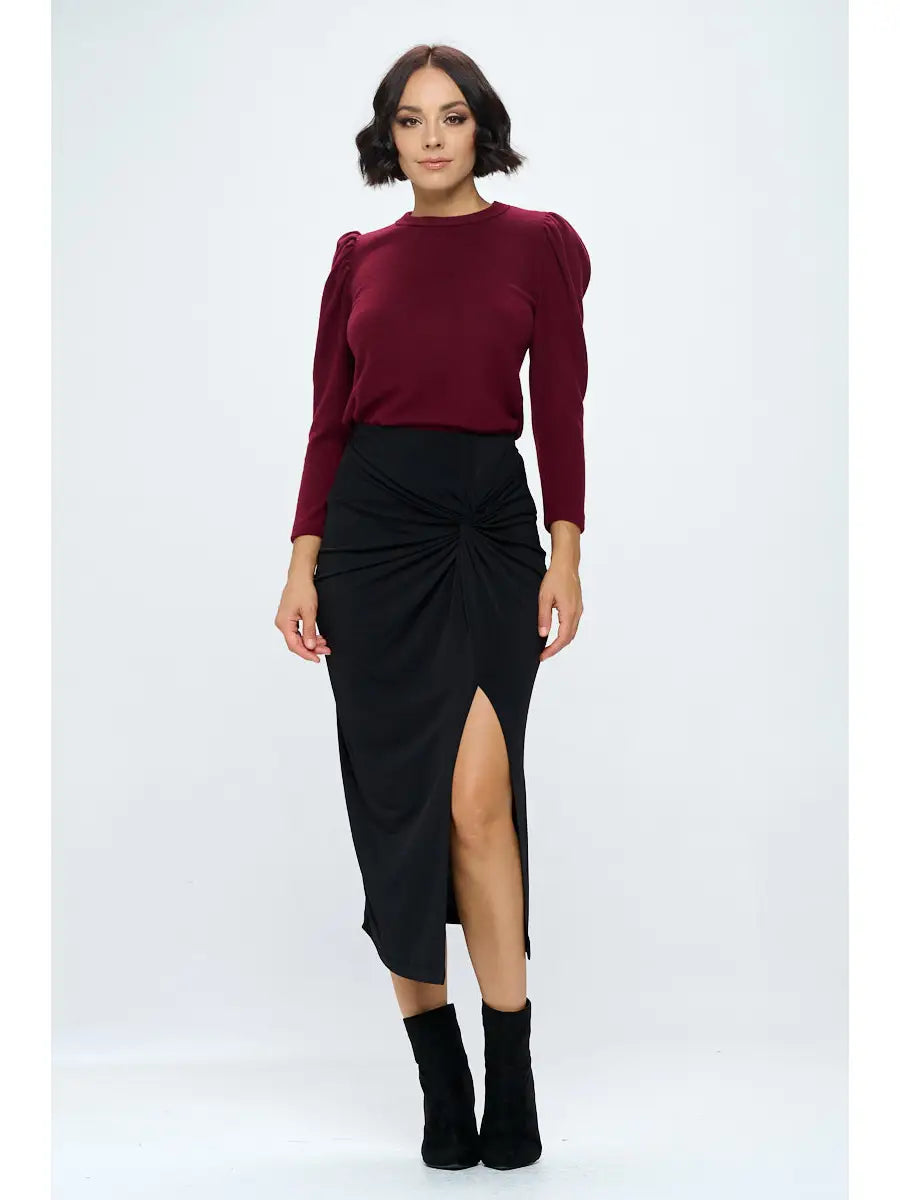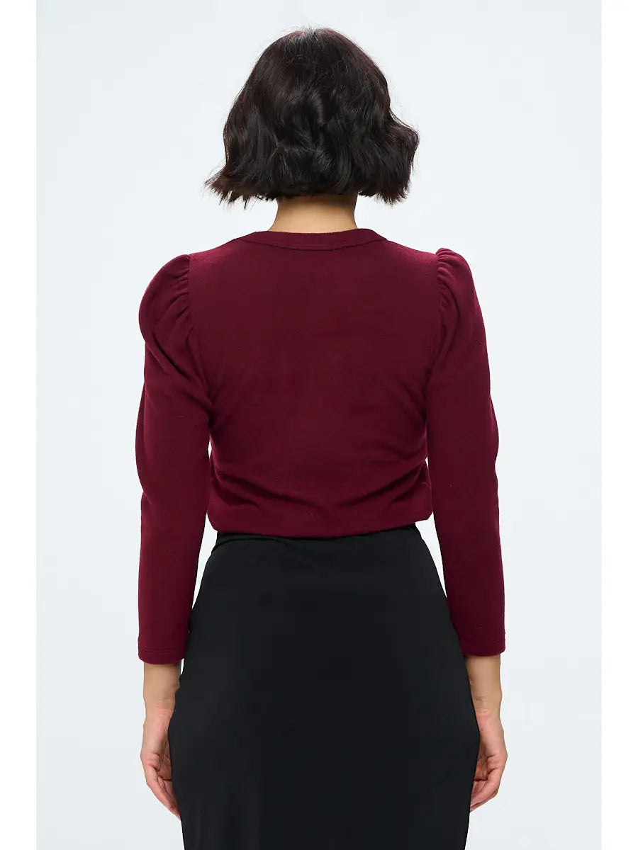 Burgundy brushed knit top with puff sleeve. Made in the United States.