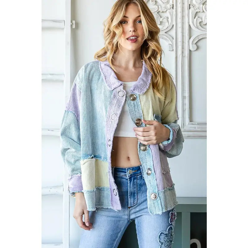 Pastel colorblock corduroy jacket. Snap buttons, mineral wash details, relaxed fit. 100% cotton.