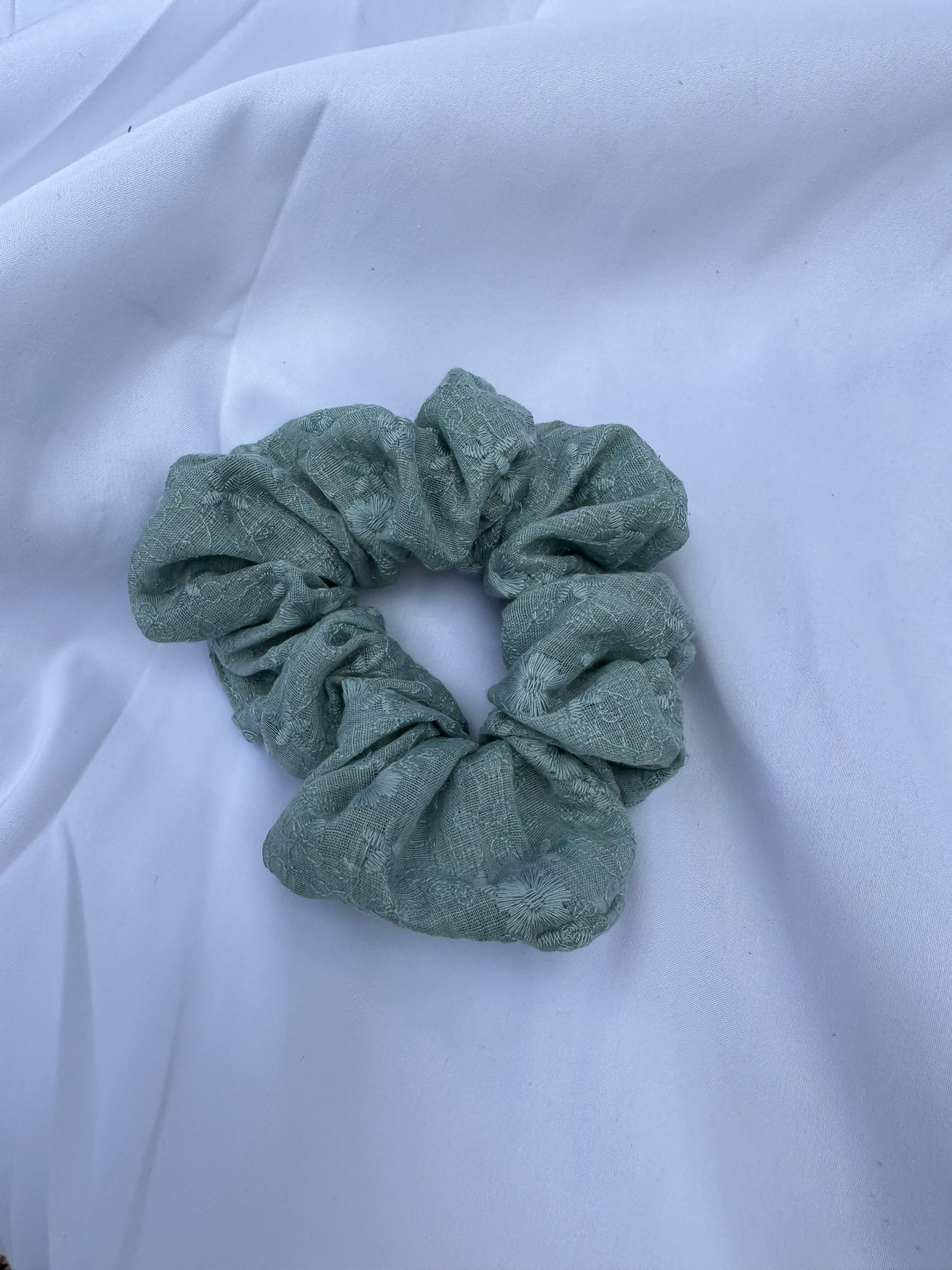 Light blue/teal embroidered floral scrunchie. Made in the United States.