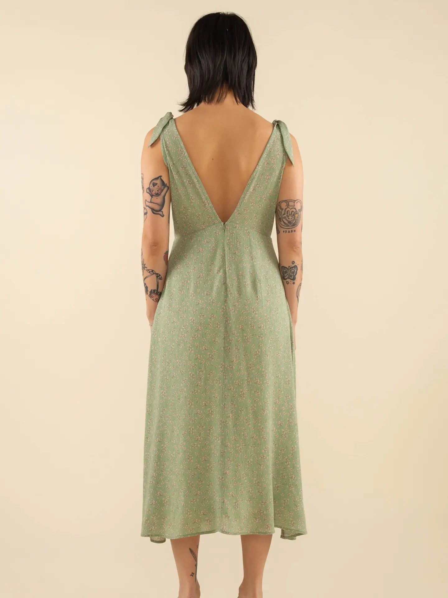 V-neck rayon gauze print midi dress with ties at shoulder and zip at back.