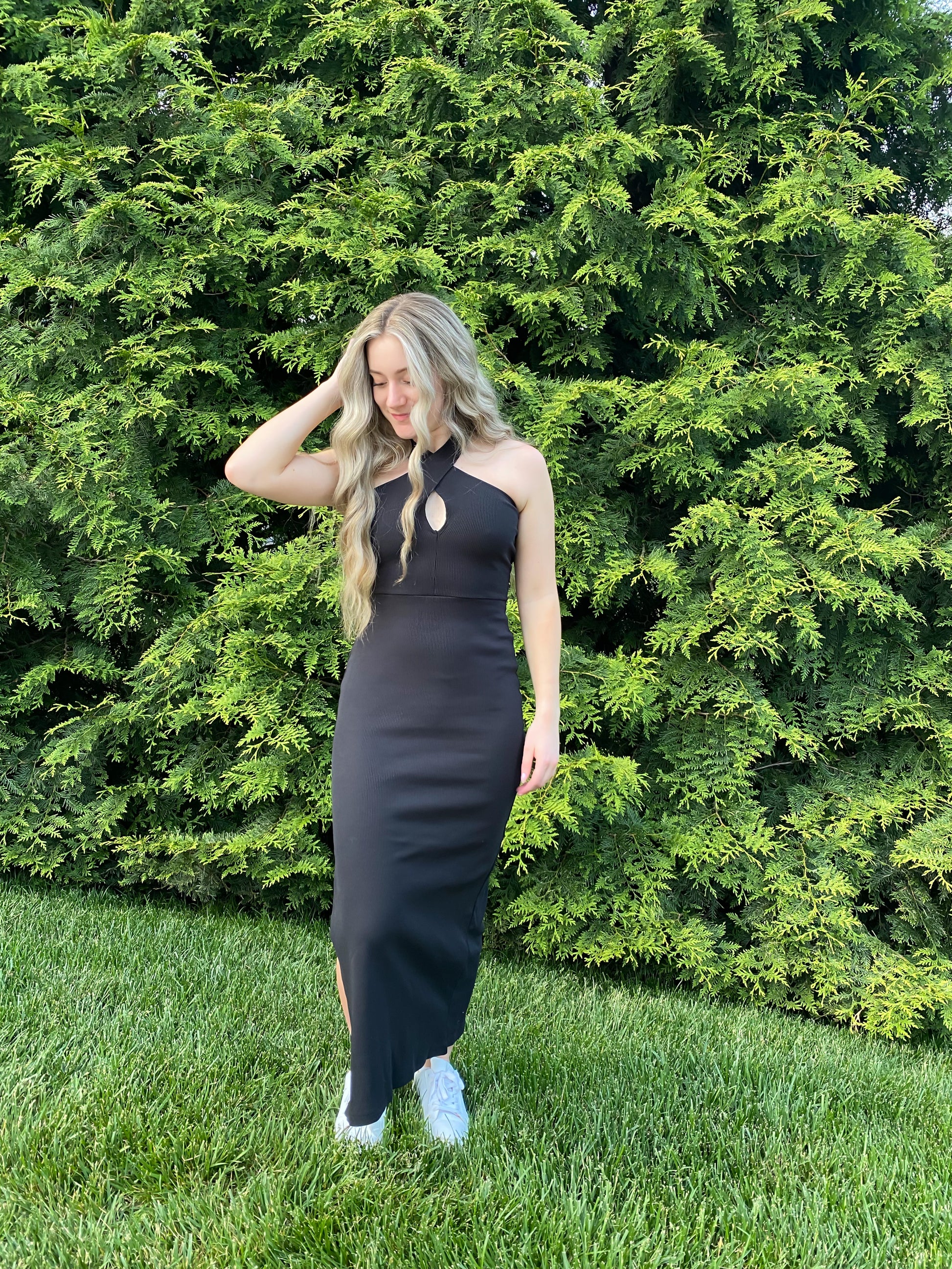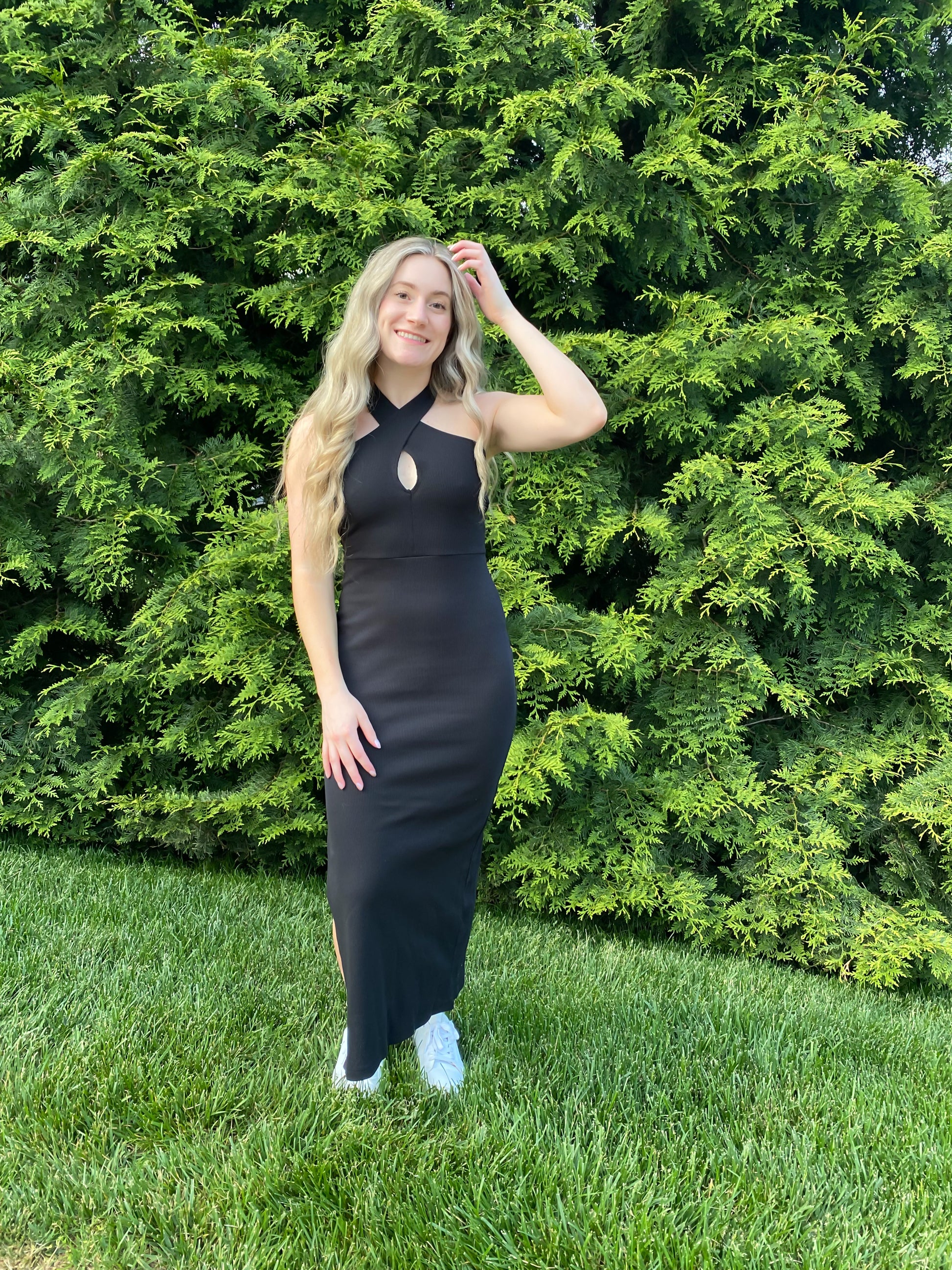 Black Knit Dress with Criss Cross Halter Neck and Keyhole Detail. Made in the United States.