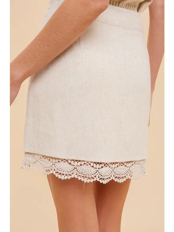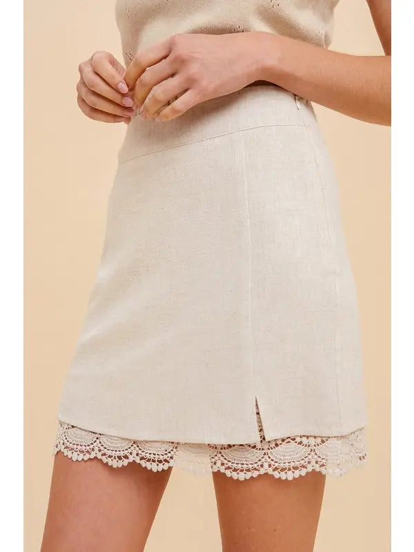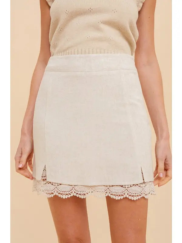 Lace hemmed linen blend mini skirt. Oatmeal colored with lining and side zipper.