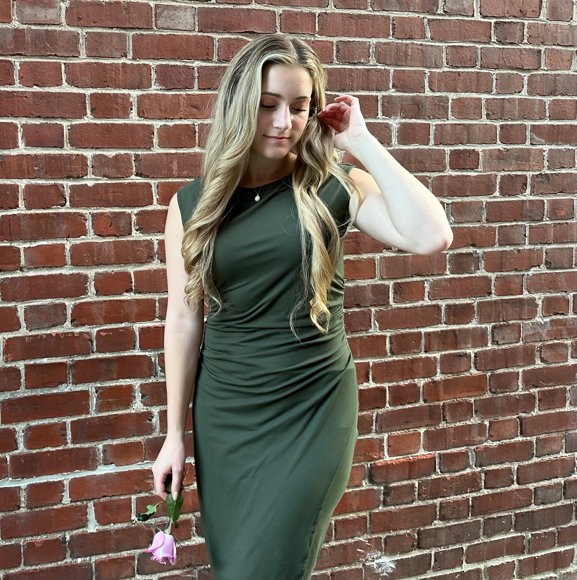 Made in USA brushed knit short sleeve bodycon dress with slit.