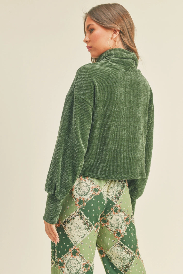 Olive green, chenille, long sleeve, turtleneck sweater.