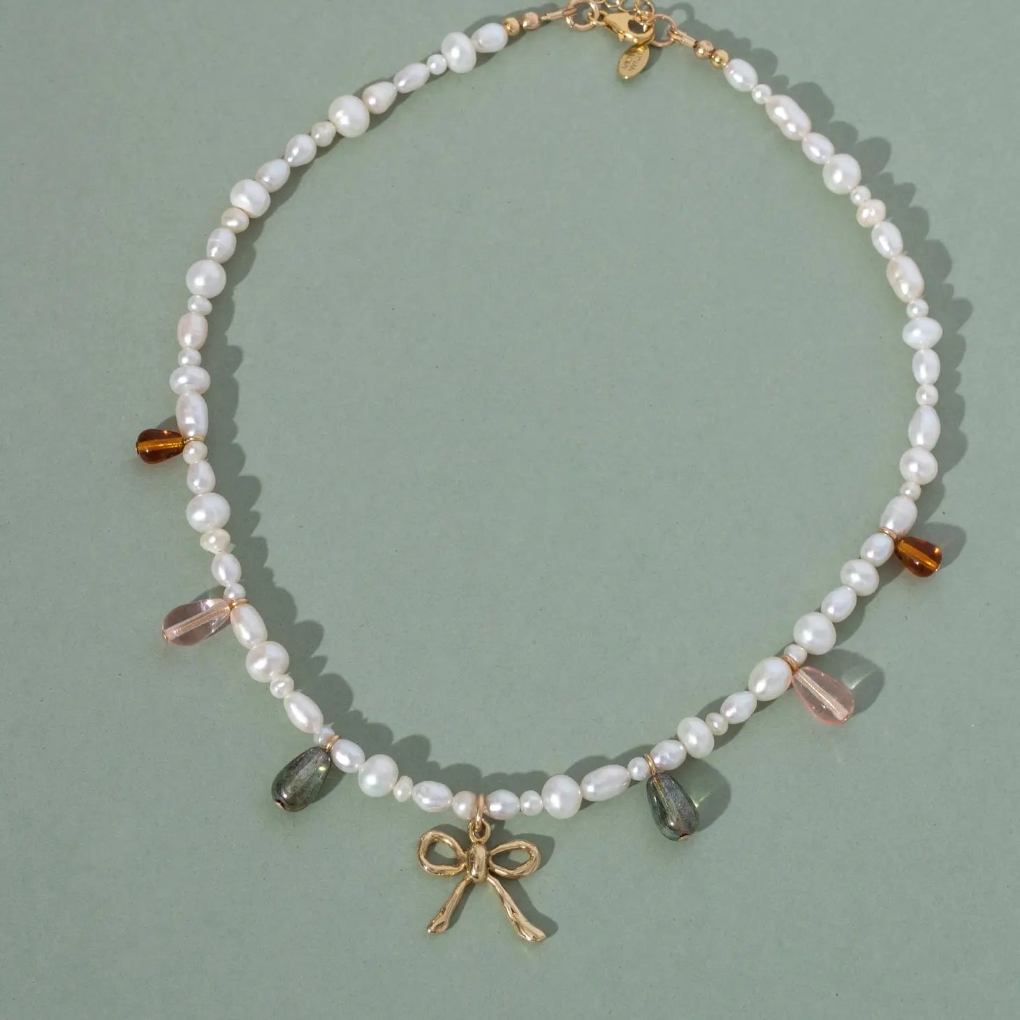 The necklace features freshwater pearls, Czech glass beads, and a dainty bow charm that was hand carved in wax and cast into yellow bronze.