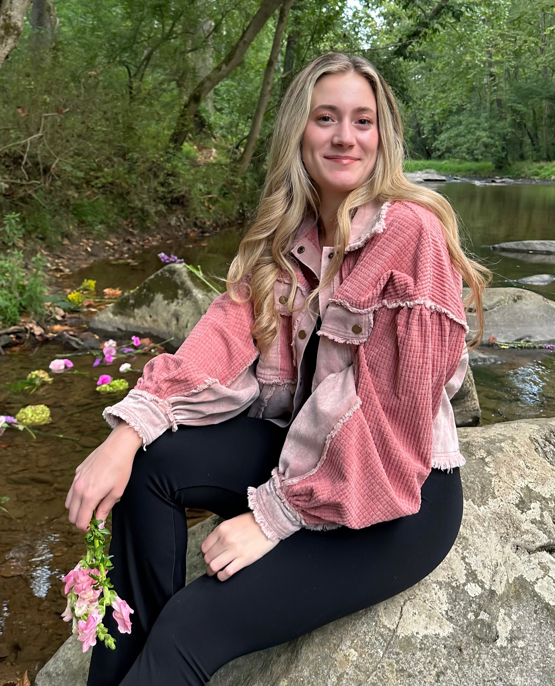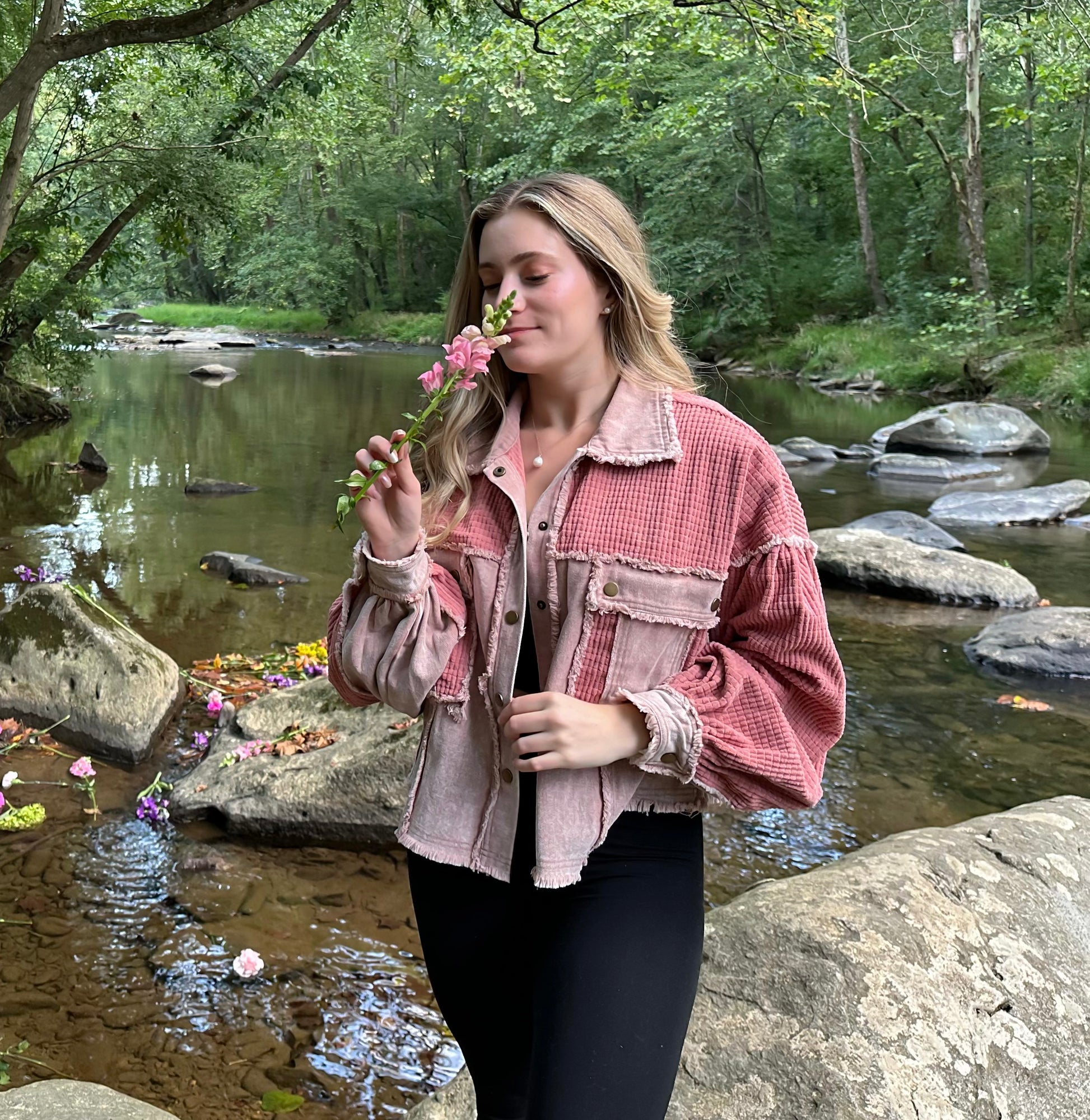 Washed fabric mix cropped jacket. Two-tone pink. Snap buttons.