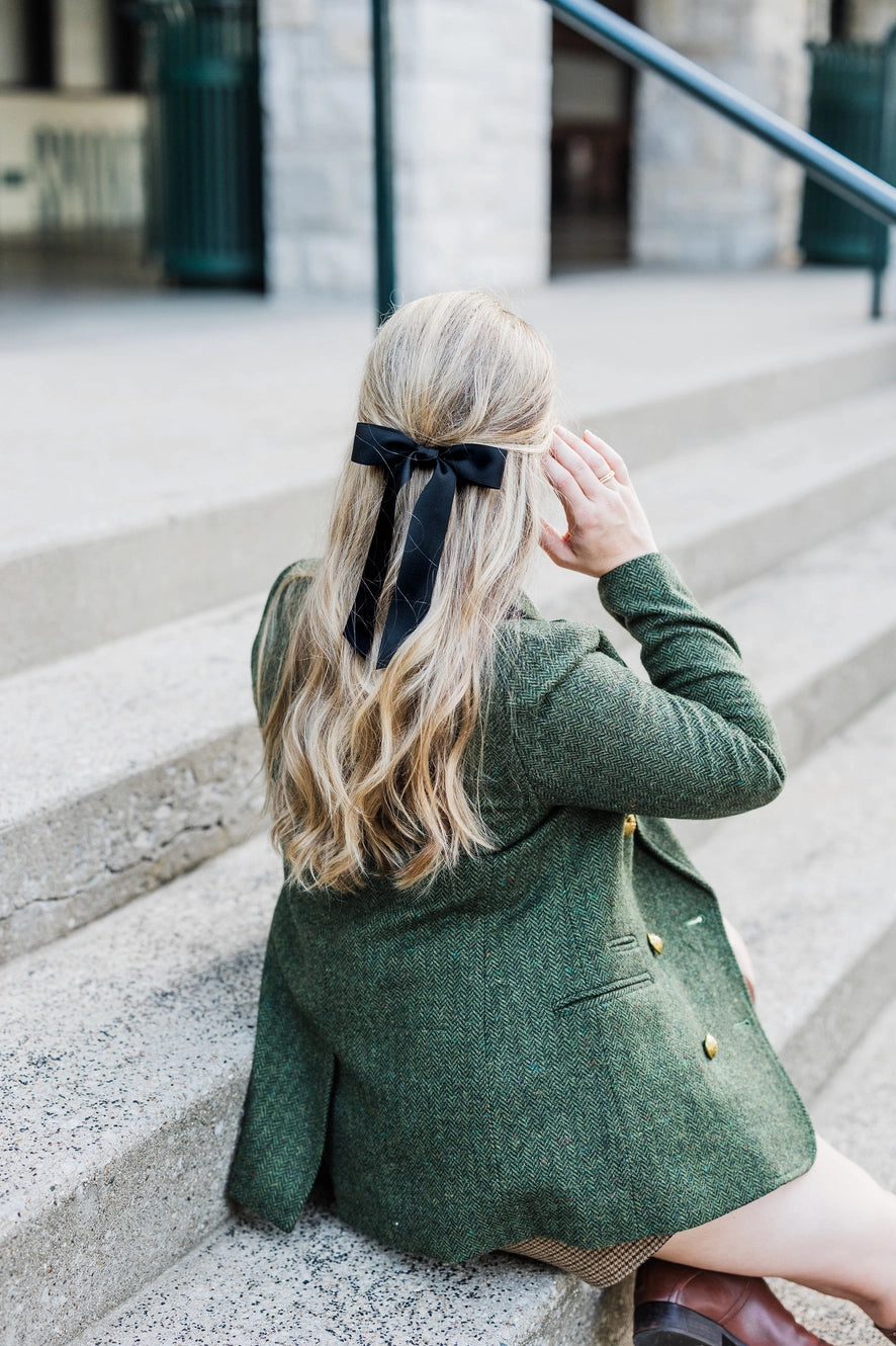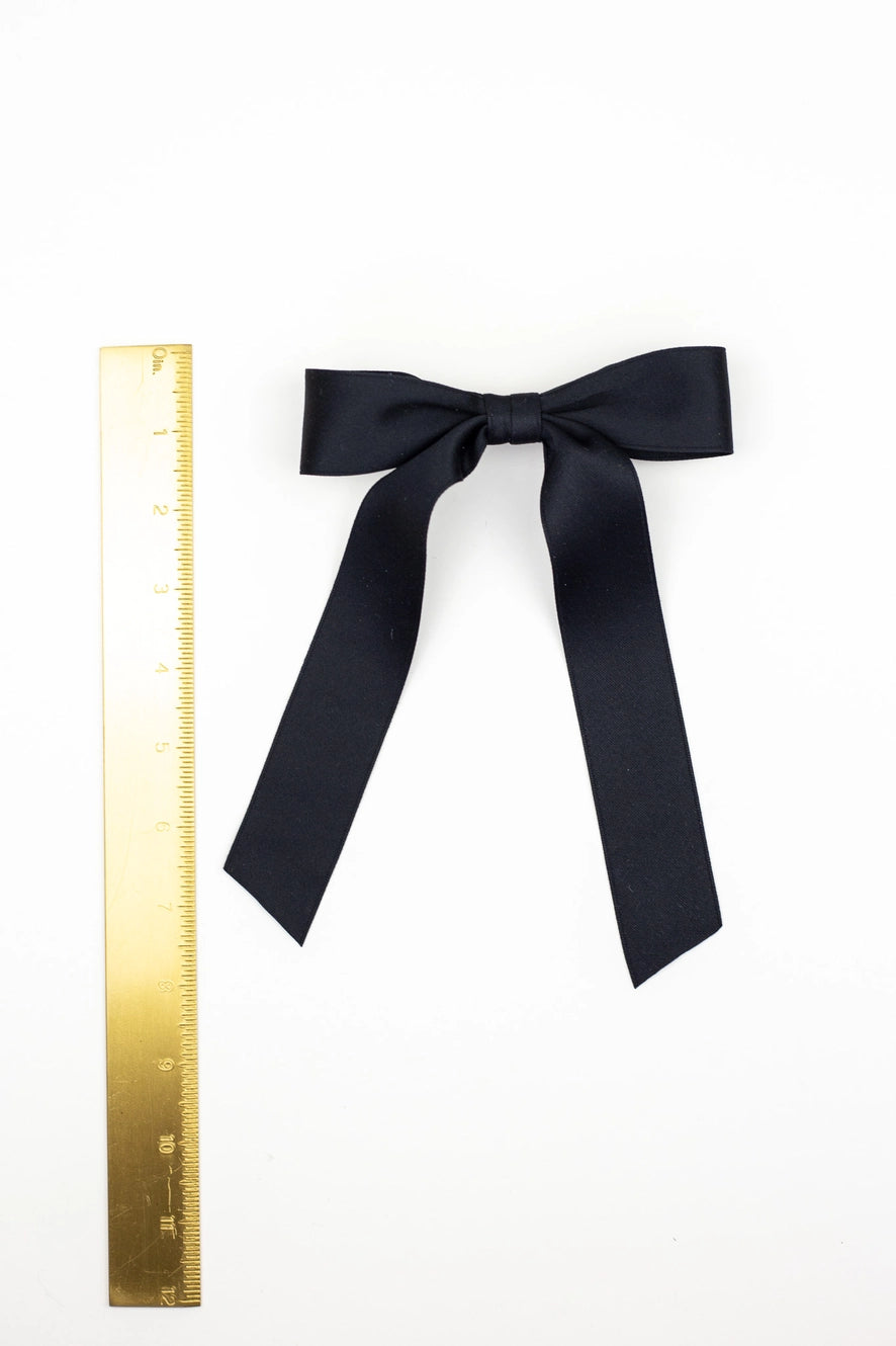 Bow measures approximately 5.5" wide and tails are approximated 7.5" long from top of bow to longest tip. This bow is secured on a 3" French barrette.